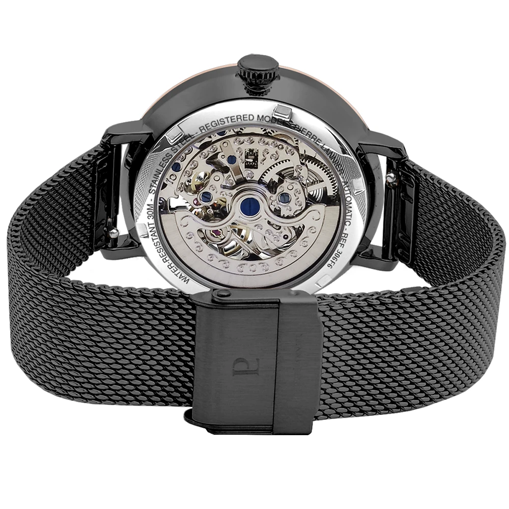 La montre Femme automatique Eolia possède un boitier rond en acier poli inoxydable, couleur anthracite et fait 37 mm de diamètre. A l’intérieur, on retrouve les arabesques typiques de la collection Eolia, qui ont fait sa renommée. Le cadran coeur ouvert laisse entrevoir les rouages du mécanisme et possède une découpe florale très délicate. Les index sont empierrés et les aiguilles de couleur doré rose. Cette couleur est rappelée sur le logo, mais également sur la lunette de la montre.