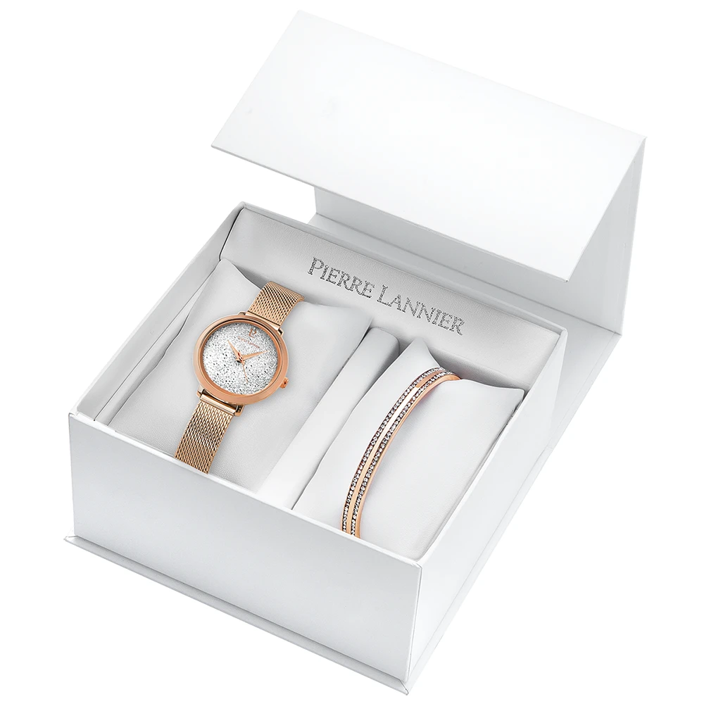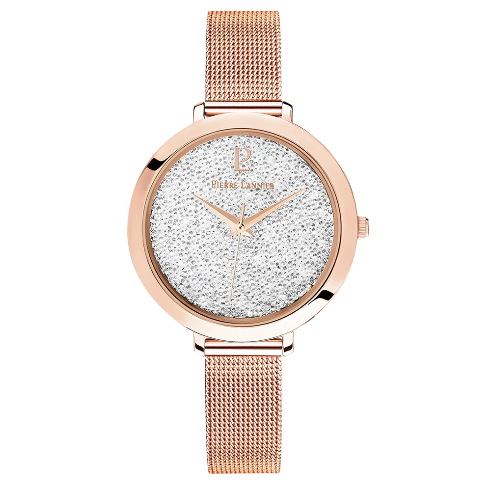 Dotée d’un boîtier acier doré-rose de 36 mm de diamètre, ce modèle se distingue par le raffinement de son cadran blanc orné de cristaux, rehaussé par les aiguilles et la signature Pierre Lannier à 12 heures doré-rose.