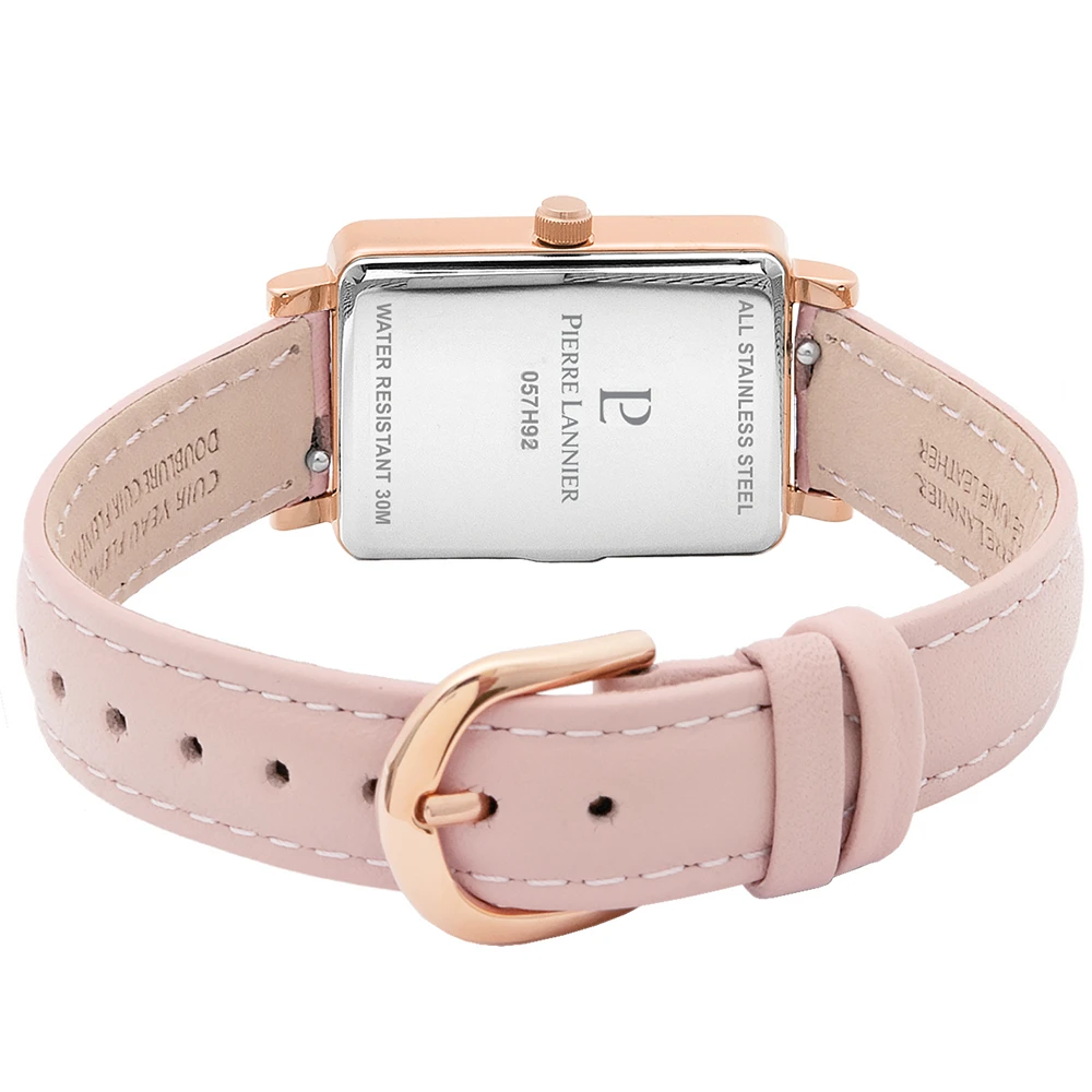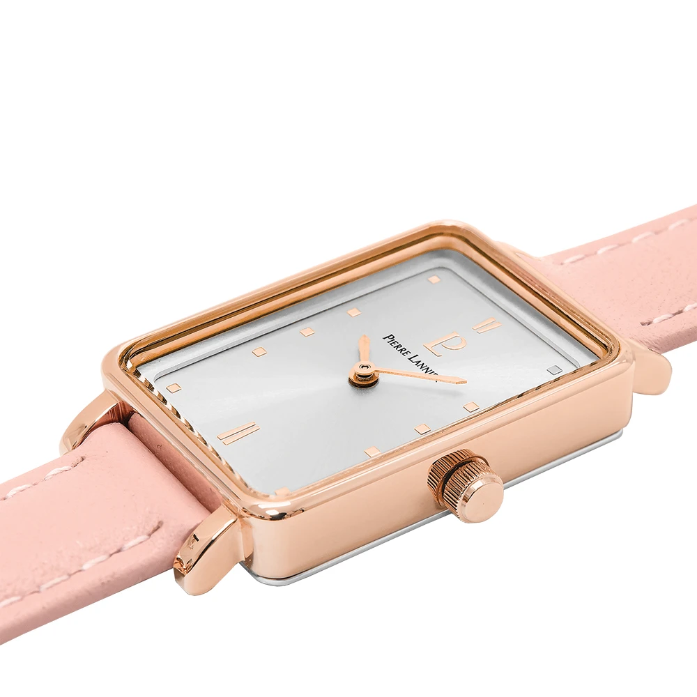La montre Femme Ariane 057H925 possède un boitier en acier inoxydable doré rose, rectangulaire, de 21mm x 28.4 mm. A l’intérieur, le cadran est argenté avec un bel effet soleillé pour apporter originalité et luminosité à ce modèle de montre pour femme. Les index sont carrés pour rappeler l’esprit vintage de ce garde temps et les aiguilles en pointe, tous deux de couleur doré rose.