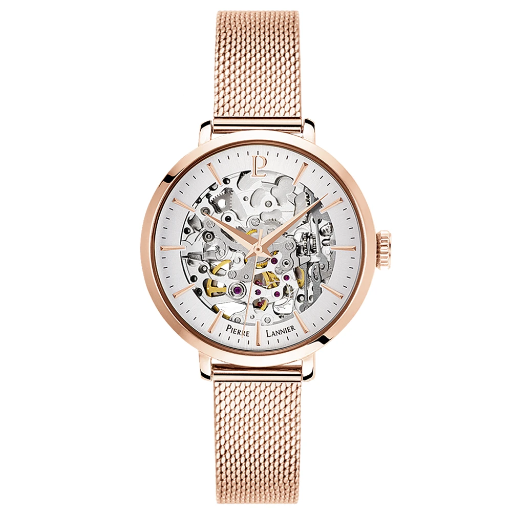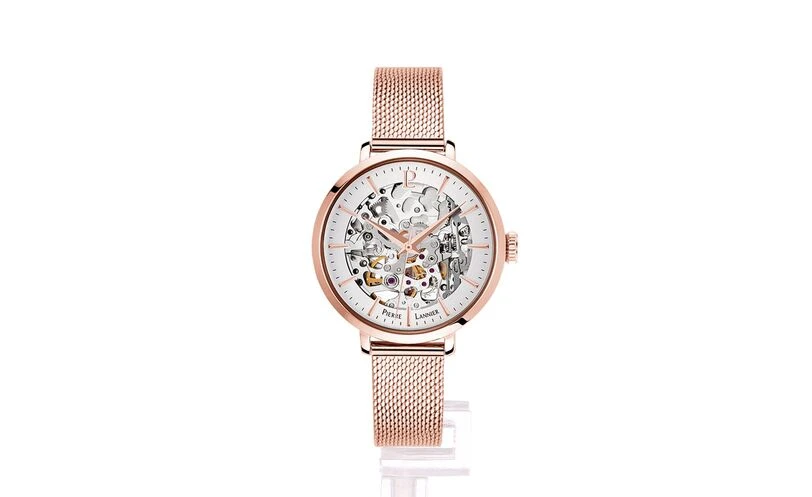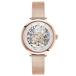 Total look doré-rose, ultra-tendance, ce modèle possède un boîtier en acier inoxydable qui se marie parfaitement avec la lunette aux mêmes teintes doré-rose. Son mouvement automatique est subtilement dévoilé par son cadran squelette, exposant avec harmonie ses rouages.