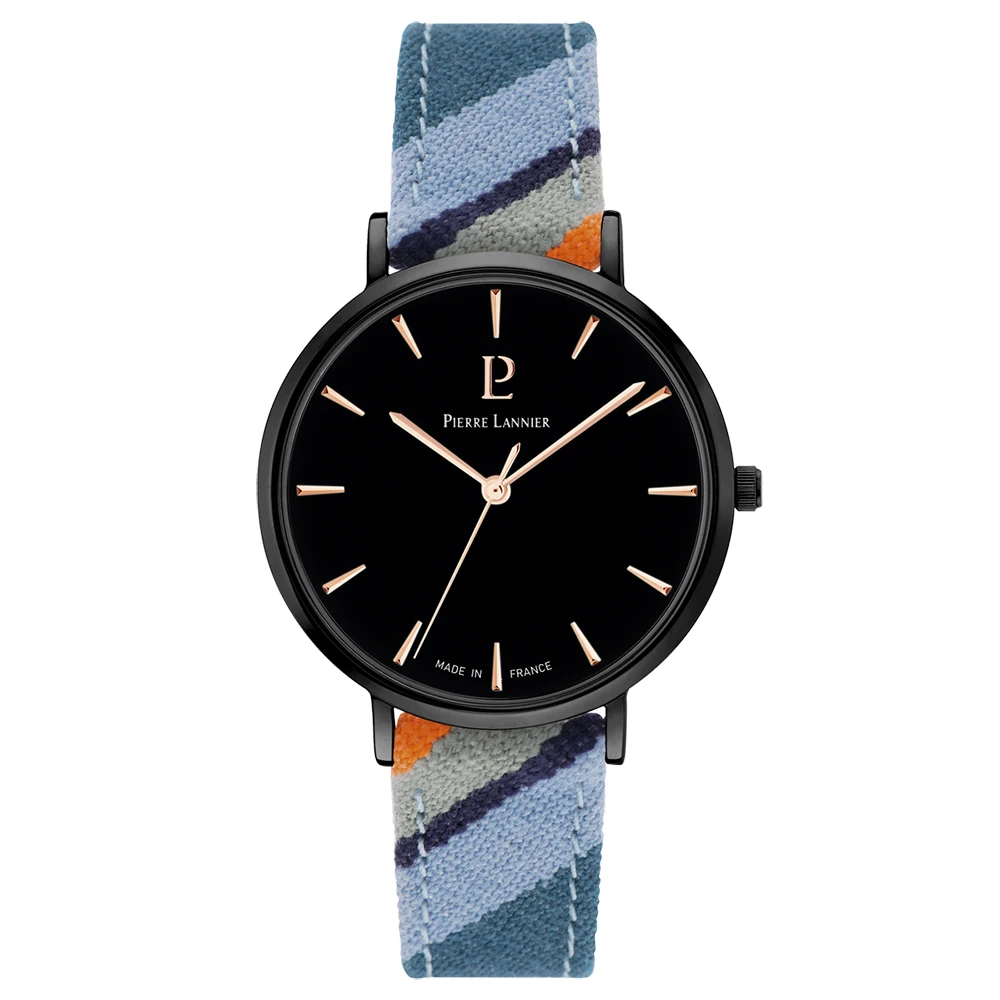 L’alliance du noir profond du boîtier en acier poli et des couleurs captivantes bleutées du bracelet en tissu 16mm vous transporteront dans un océan de contraste et de lumière.