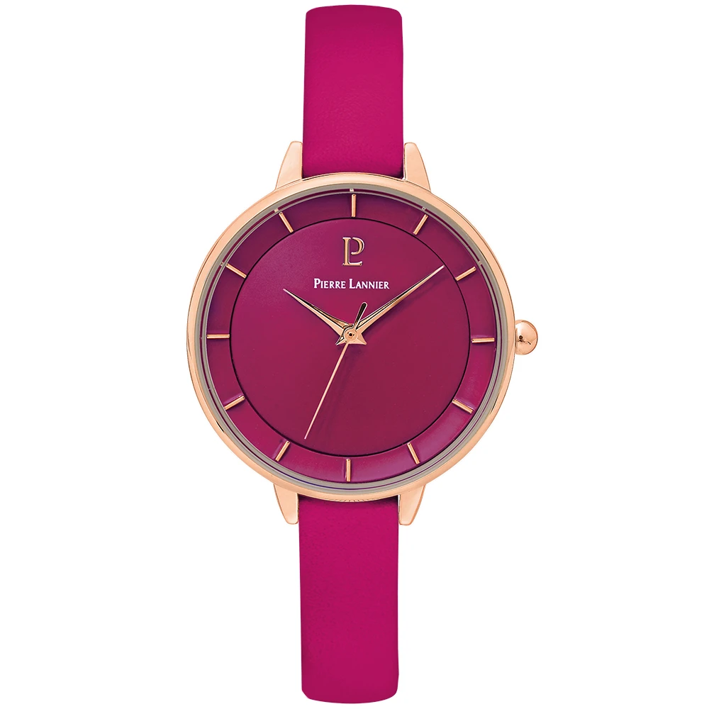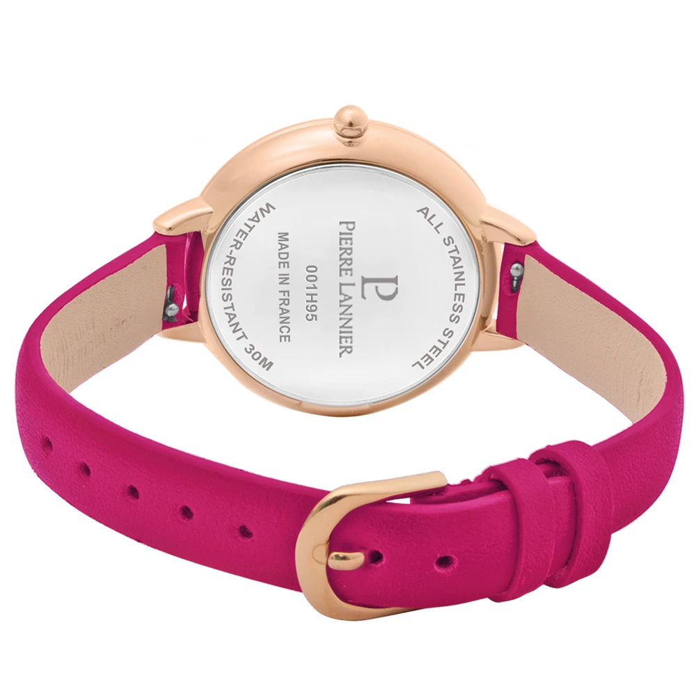La montre femme Délice 001H955 est dotée d’un boitier en acier inoxydable rond de 33 mm, de couleur doré rose. Le cadran rose framboise est bombé, accentuant ainsi la singularité de cette montre femme. Les aiguilles sont également bombées et de couleur doré rose, tout comme les index. Le logo Pierre Lannier est à 12h et termine l’aspect minimaliste de cette montre femme colorée.