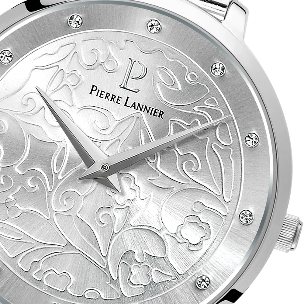 Son boitier rond de 33 mm de diamètre est en acier inoxydable et abrite à l’intérieur, le cadran argenté effet soleillé, qui la rend d’autant plus lumineuse. Les index sont empierrés et les deux aiguilles sont également argentées. Les motifs emblématiques de la collection de montres Eolia sont en relief argentés et apportent la touche féminine et fleurie à cette montre.