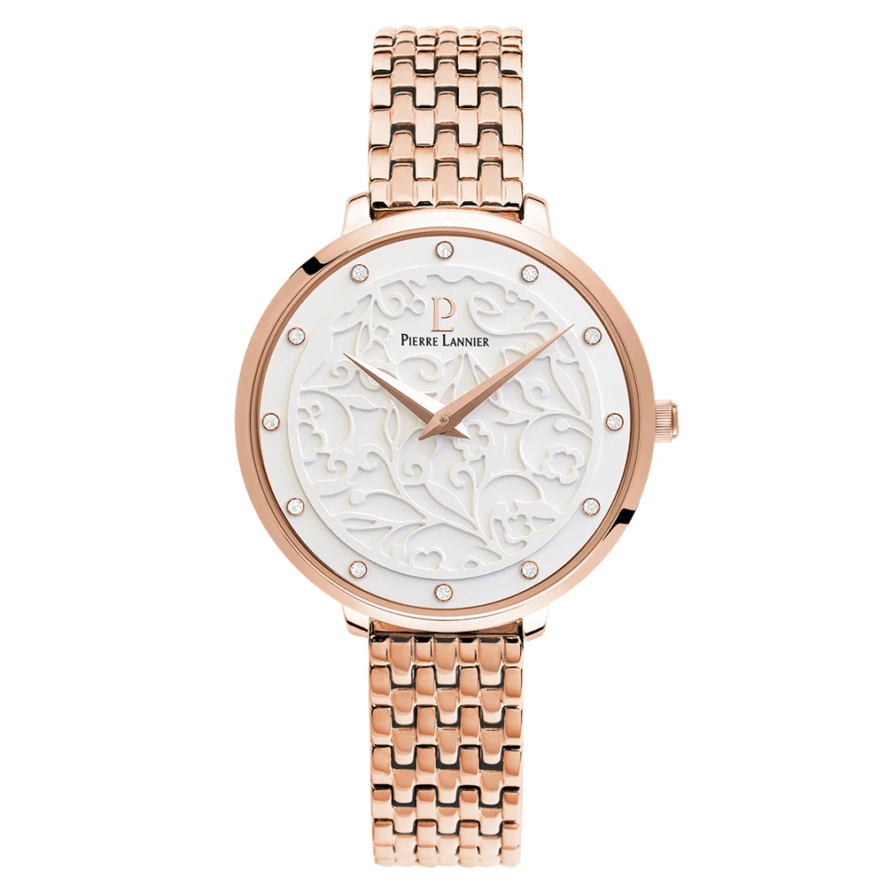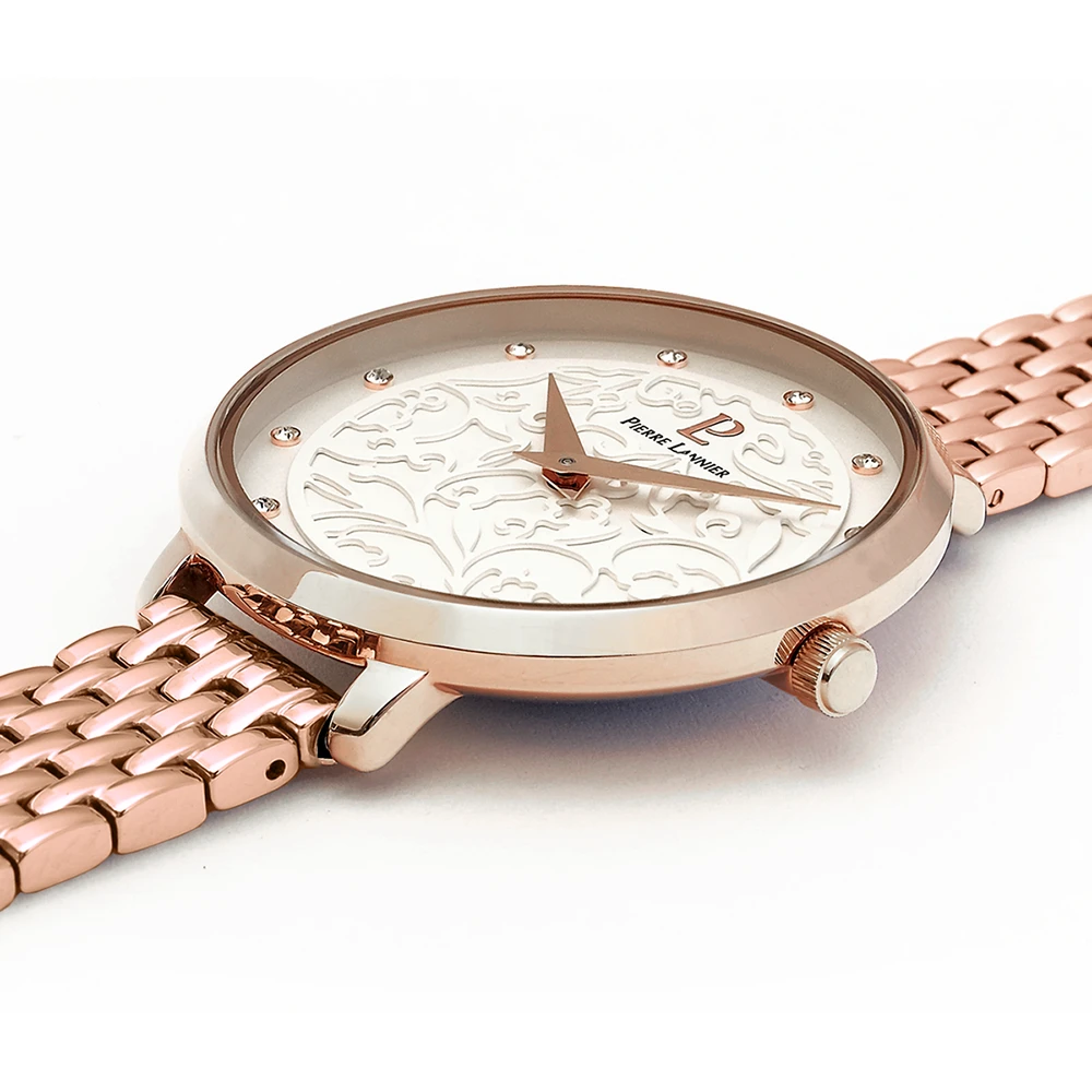 Son boîtier en acier inoxydable de 33 mm de diamètre aux teintes doré-rose abrite un fond de cadran blanc laqué sur lequel sont brodées de fines fleurs.