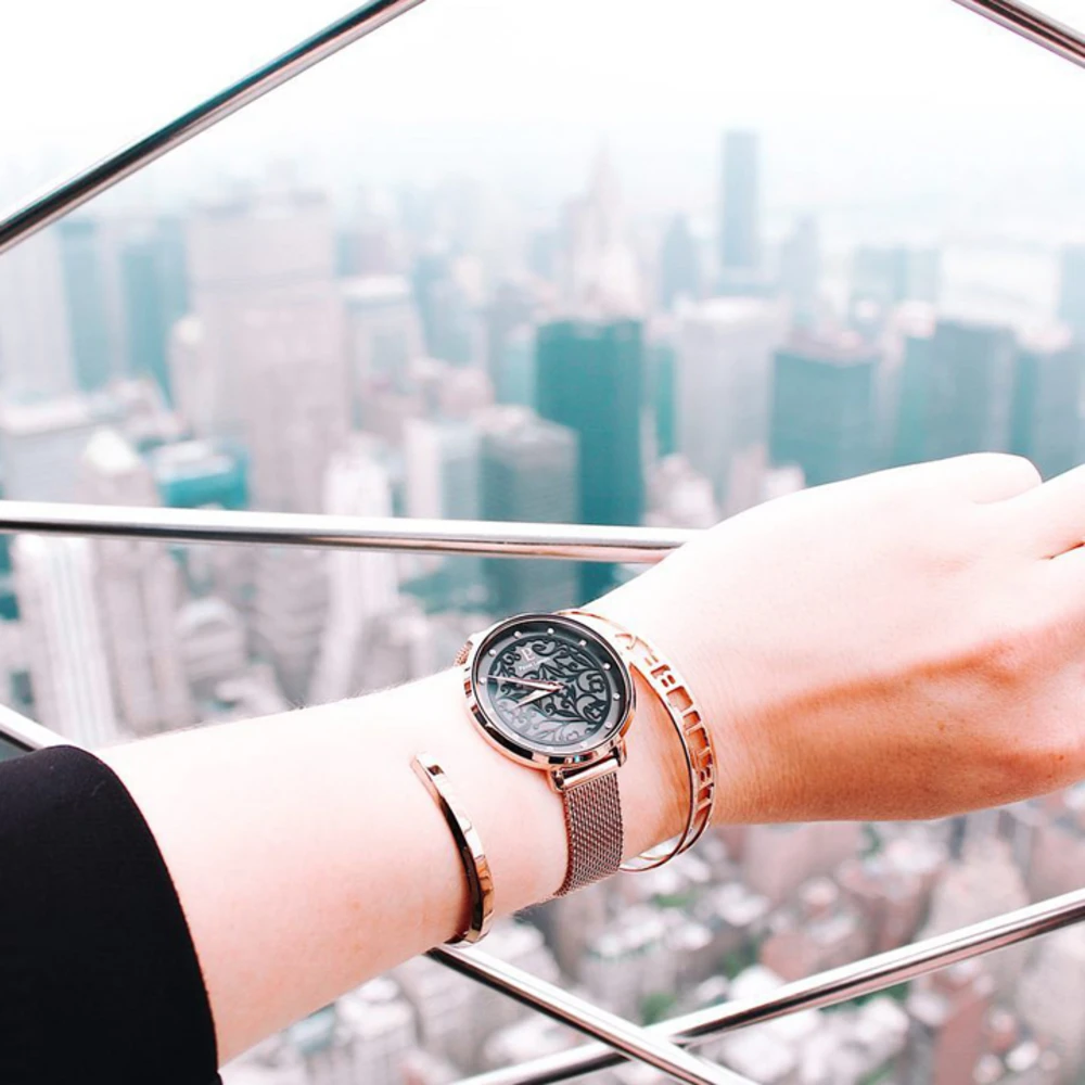 Son boîtier est en acier inoxydable de 33 mm de diamètre de couleur doré-rose et abrite un fond de cadran noir laqué subtilement rehaussé par les fines broderies aux motifs floraux.