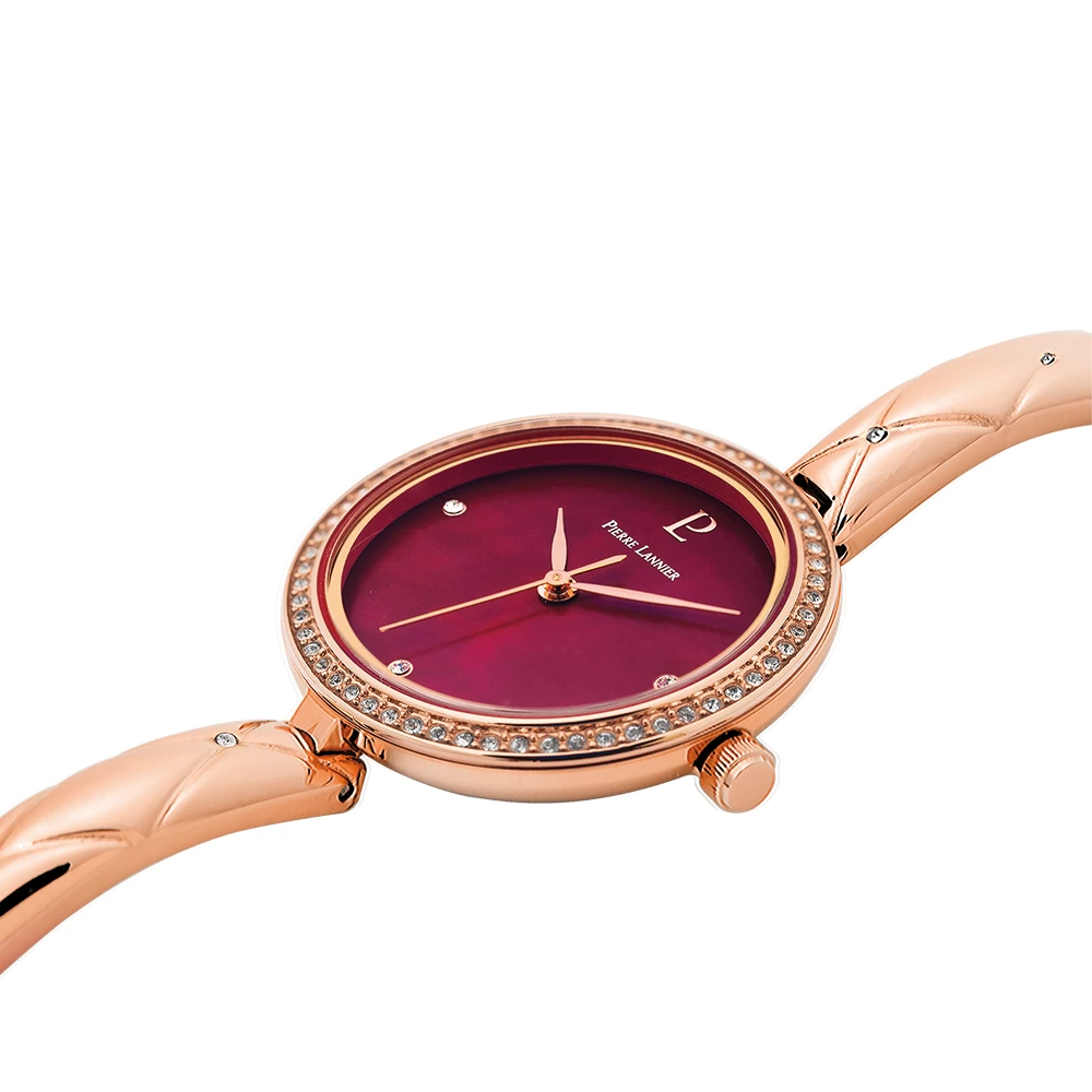 La Montre Femme Leia possède un boîtier en acier doré-rose d’un diamètre de 29,5mm. Sa partie supérieure, incrustée de pierres, renferme la pièce maîtresse de ce modèle : un cadran framboise à l’effet nacré, surmonté d’aiguilles doré-rose et d’index en pierres incrustées. Son verre minéral lui permet une étanchéité jusqu’à 30m de profondeur.