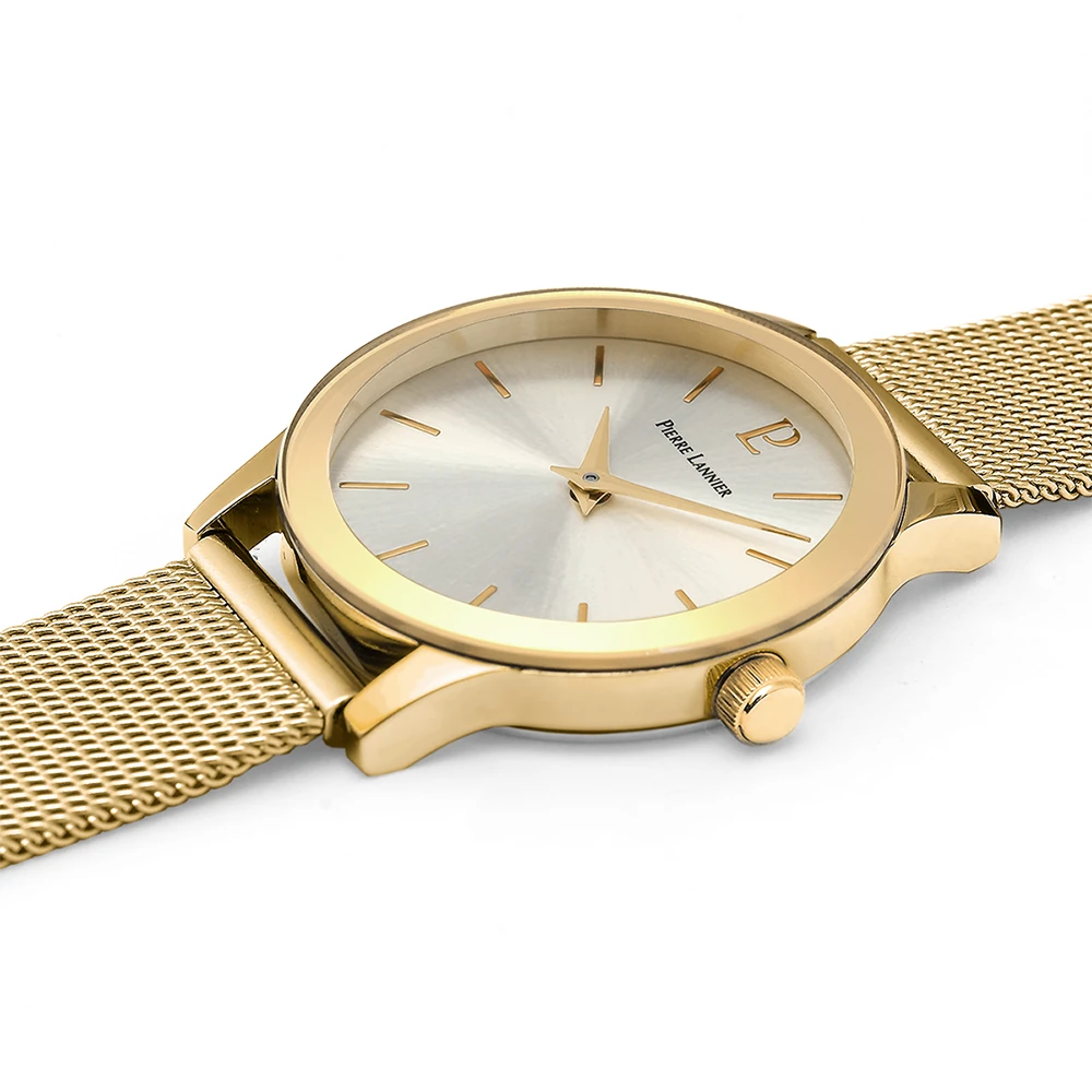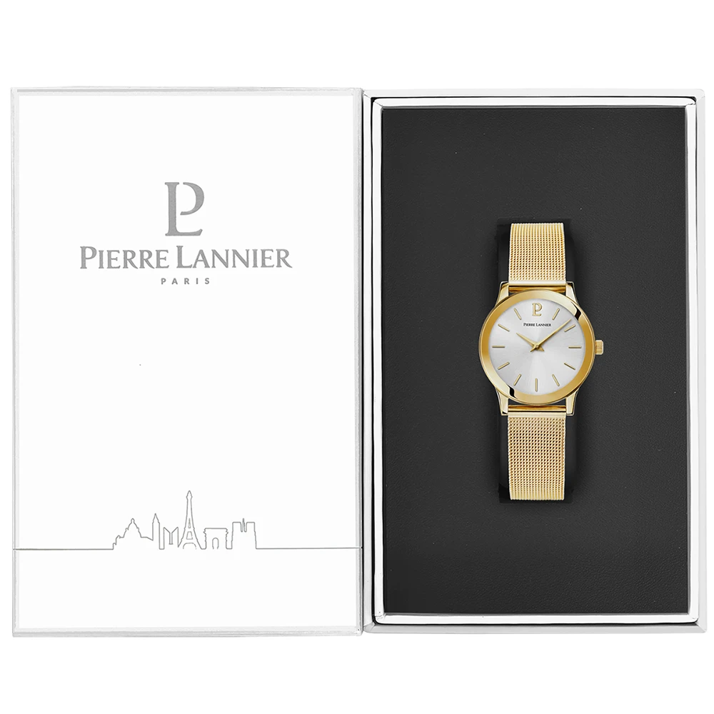 Les fines aiguilles, les index bâtons et la signature Pierre Lannier à 12 heures aux teintes dorées se démarquent du fond de cadran blanc soleillé de ce modèle pour un rendu lumineux.