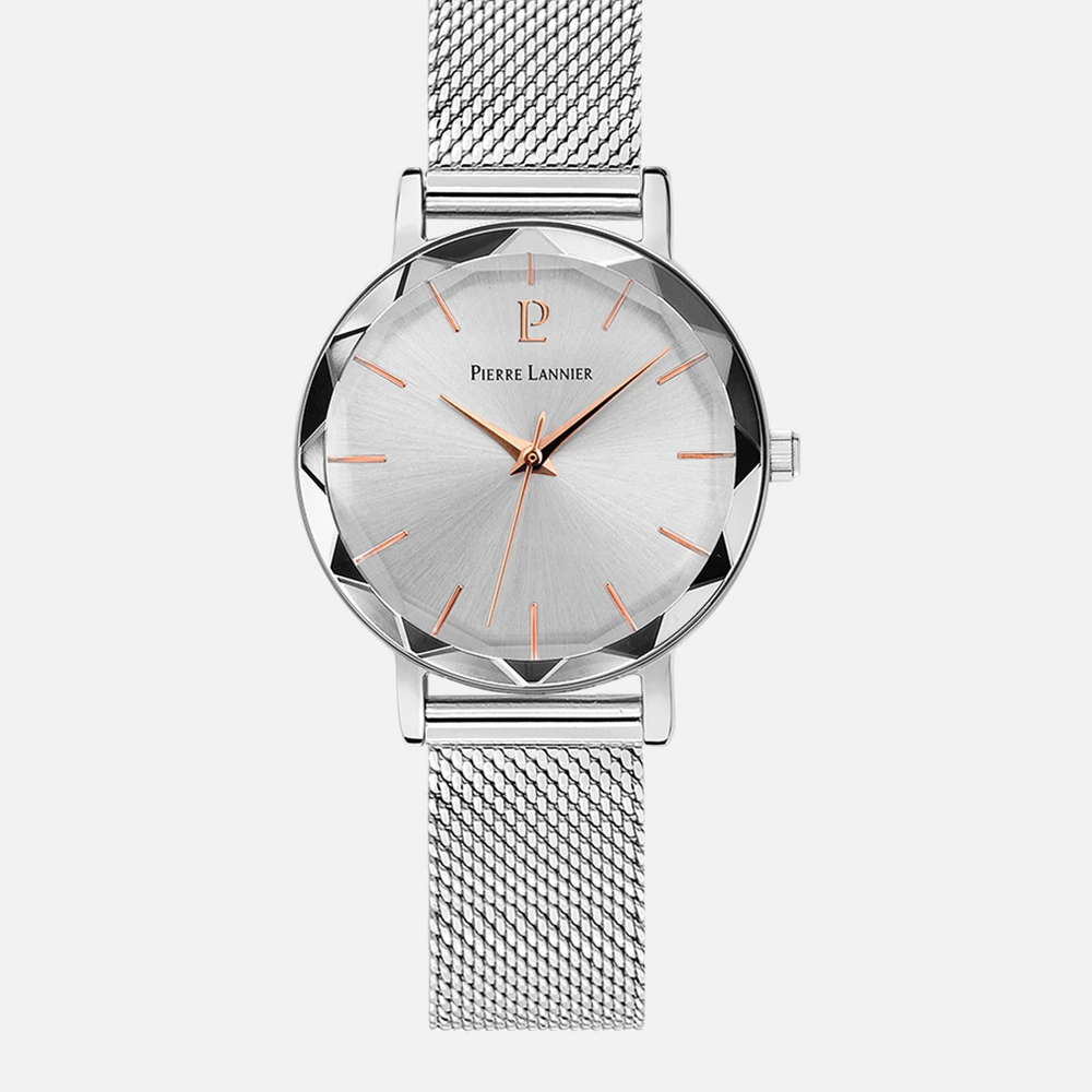 Avec son verre facetté, elle possède un effet totalement captivant : il retombe sur le boitier en forme d’étoile et lui donne un rendu très original. Son boitier de 30 mm de diamètre est en acier inoxydable et de couleur argenté. Le cadran, aussi de couleur argenté a un effet soleillé, qui apporte encore de la luminosité à ce modèle très élégant.
