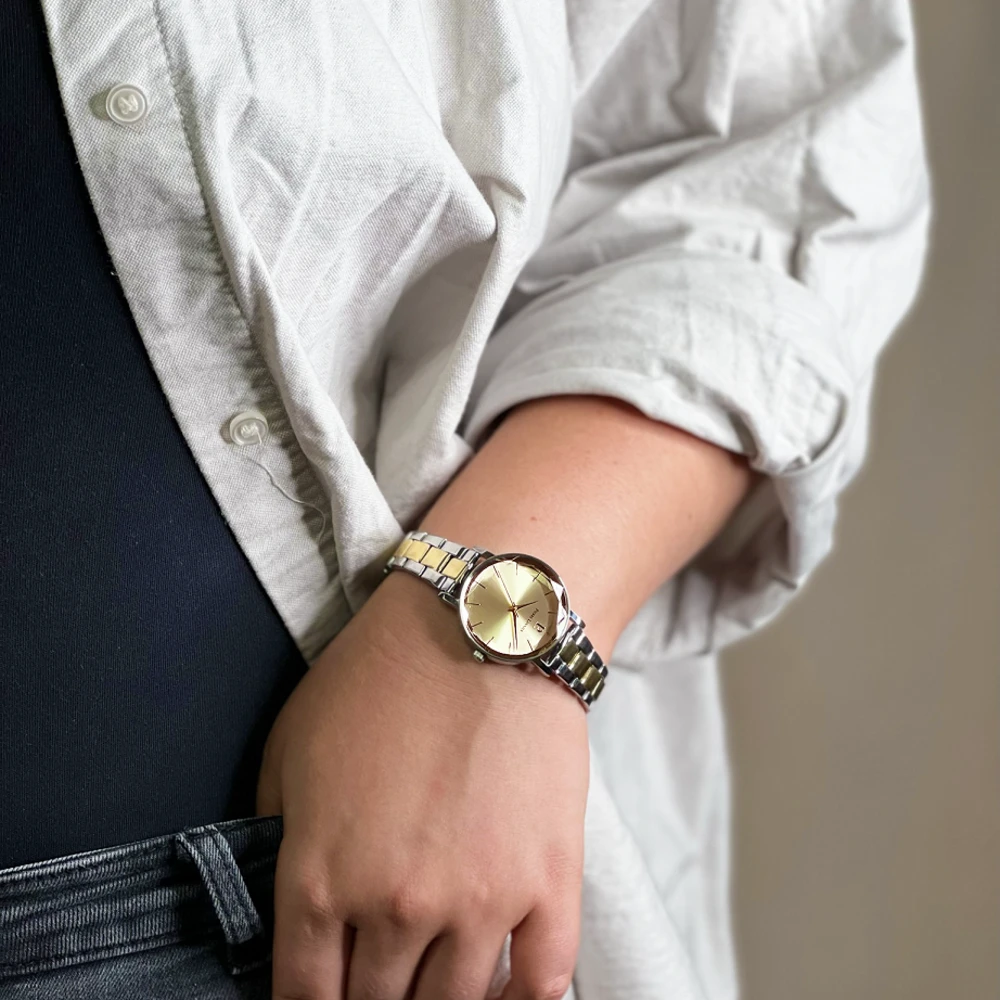 La montre Femme Multiples Quartz 012P741 possède un boitier en acier inoxydable : de couleur argenté et de 30 mm de diamètre, il possède une finition brillante. Le cadran est doré, avec un effet soleillé. A l’intérieur, index et aiguilles sont dorés également et ressortent de façon discrète sur le cadran. Le verre est minéral et facetté et permet d’obtenir des jeux de lumière tout à fait fascinants et singuliers.