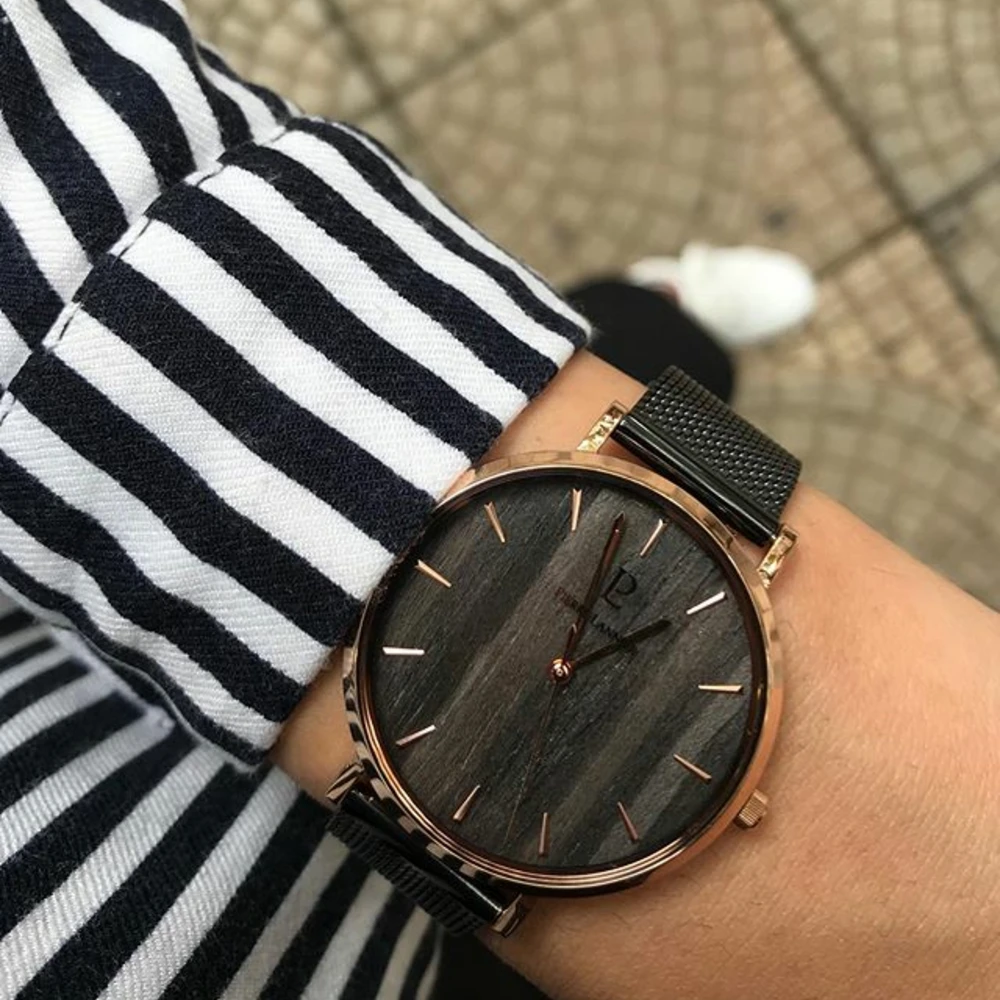 Pile dans la tendance bois, découvrez la Montre Femme 018P998 Acier Milanais Noir. Cette dernière est équipée d’un boîtier rond en acier poli inoxydable de 36 mm de diamètre et d’un bracelet milanais à clip coulissant de 16 mm de largeur, de couleur noire.