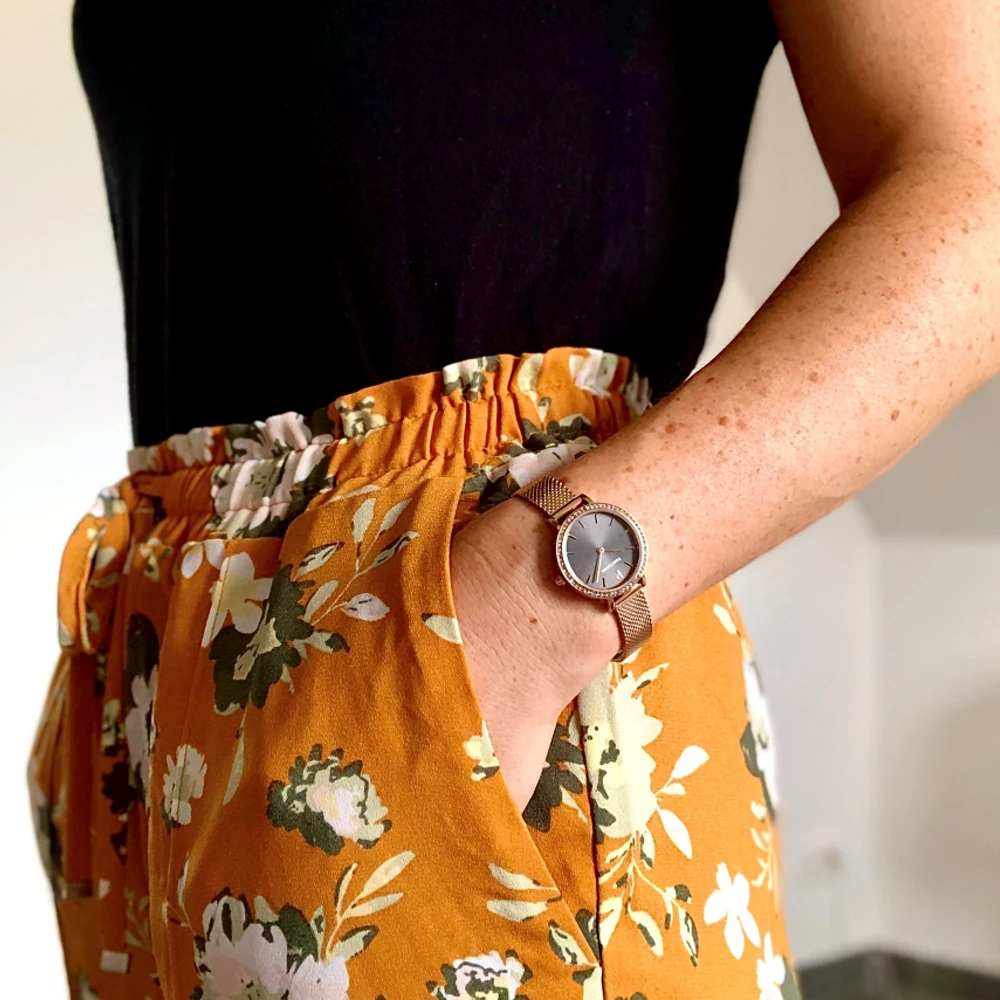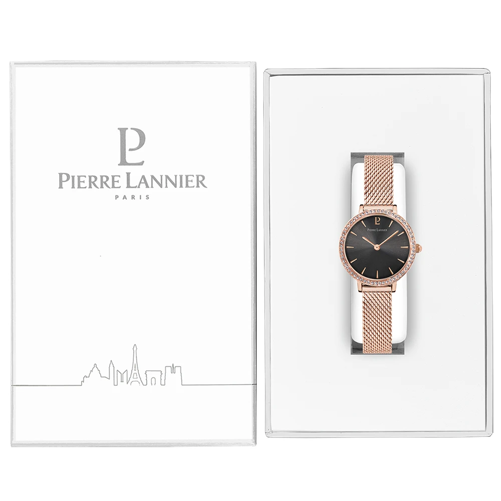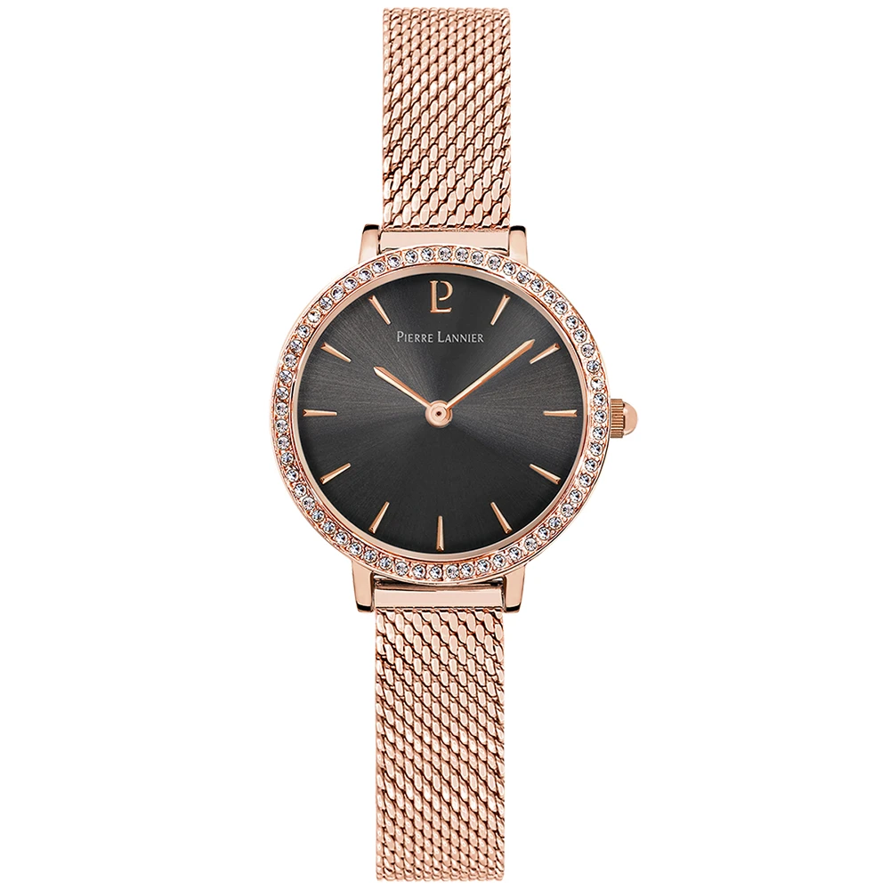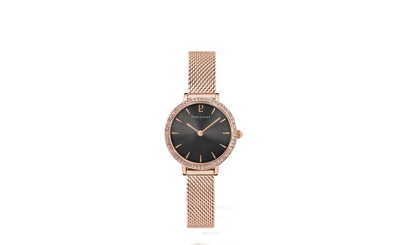 Ce joli modèle de montre femme possède un petit boitier rond en acier poli inoxydable, de couleur doré rose d’une rare finesse : 26 mm de diamètre, ce qui en fait une des plus petites montres de chez Pierre Lannier. Les index et les aiguilles de la même couleur contrasteront merveilleusement avec le cadran noir.