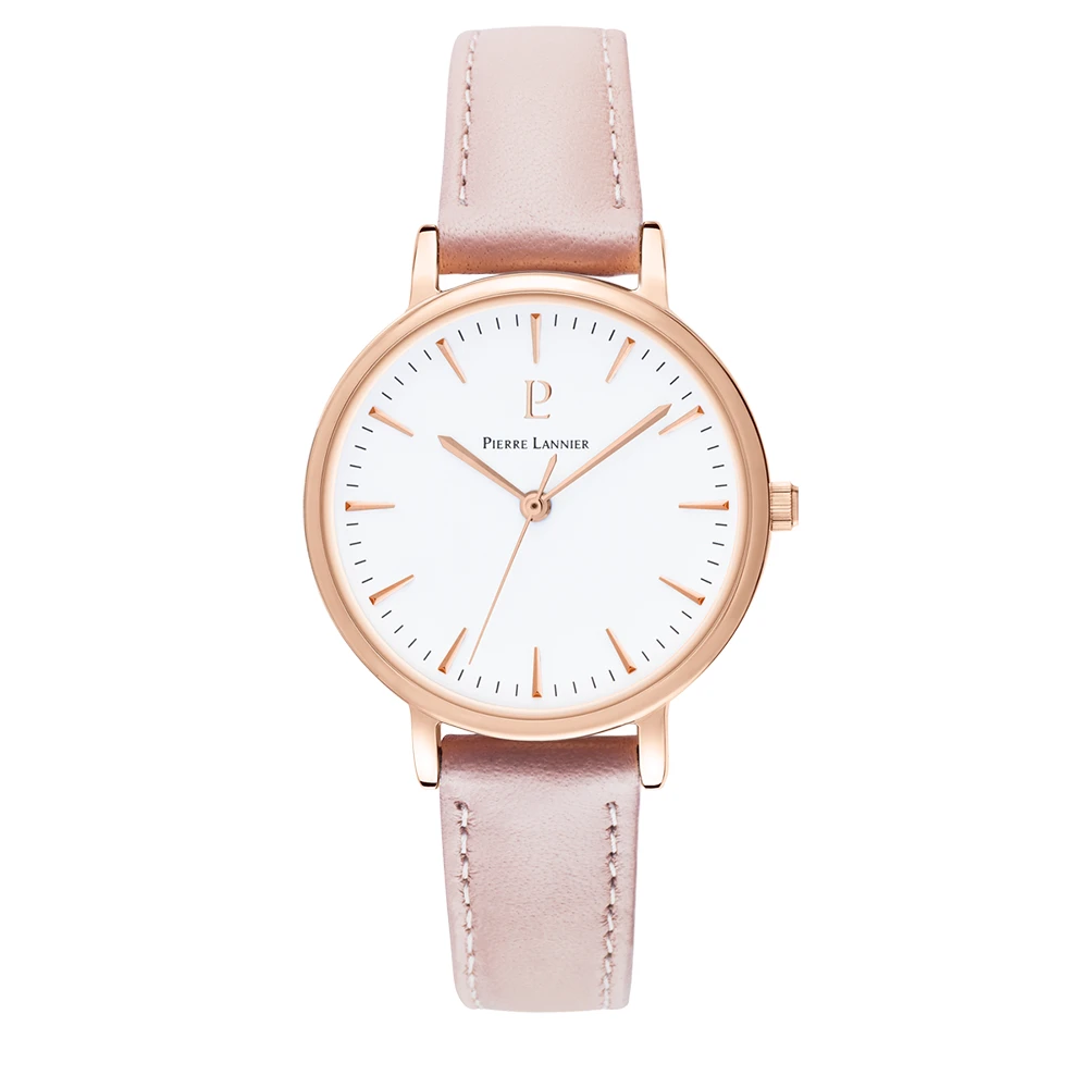 L’allure chic de la montre femme 090G905 cuir rose est également accentuée par ses finitions travaillées. Des index bâtonnets de couleur doré-rose en passant par les fines aiguilles de la même couleur qui réhaussent le fond de cadran blanc : rien n’a été laissé au hasard !