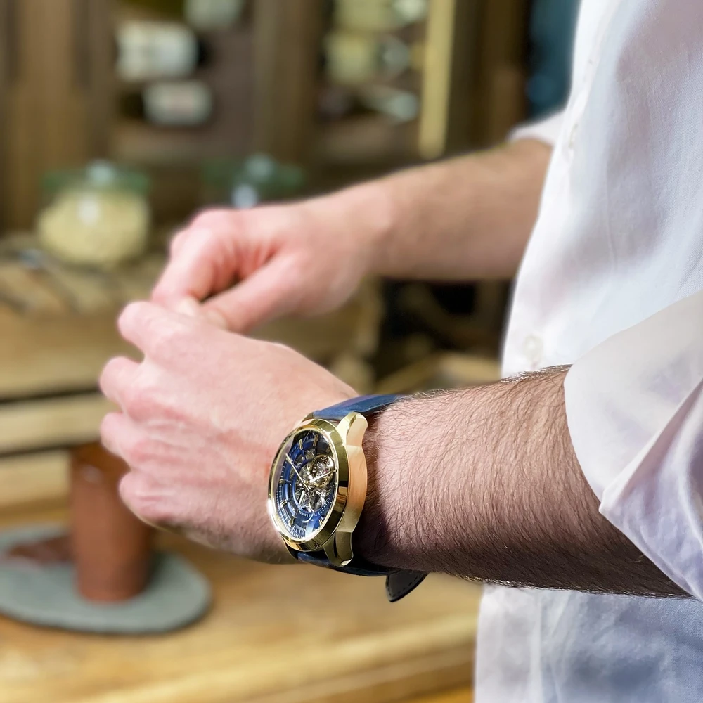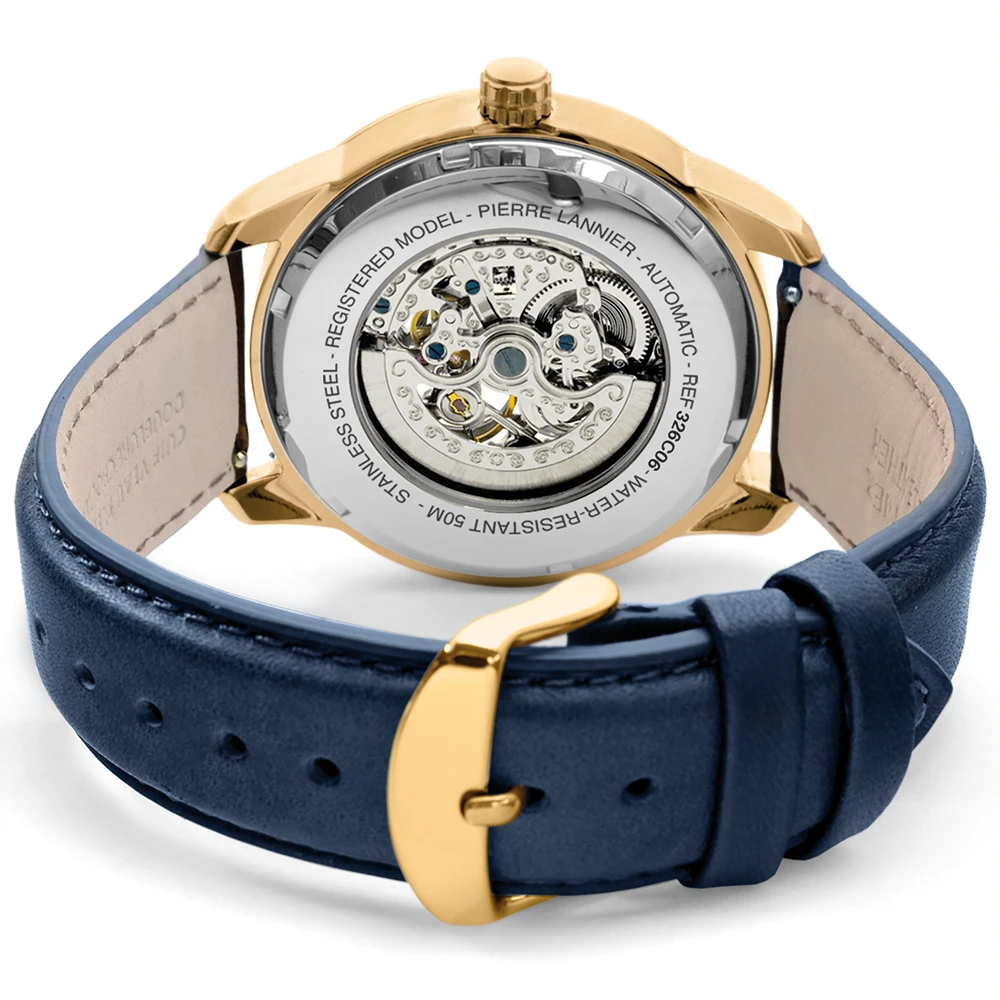 Le doré et le bleu, les deux teintes de la montre Homme Automatique 326C066 se marient à merveille et permettent au mécanisme apparent de se dévoiler en douceur.