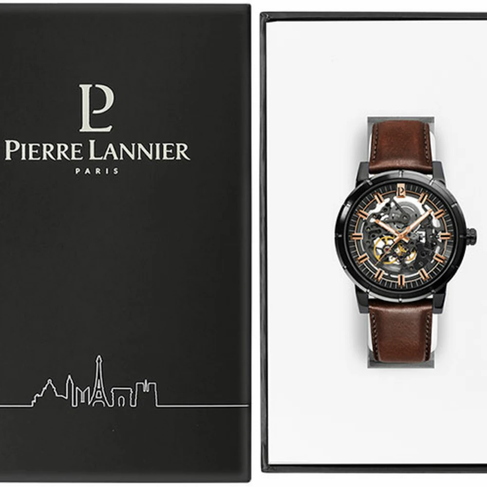 Lannier. Le boitier en acier inoxydable de ce modèle automatique est noir, et