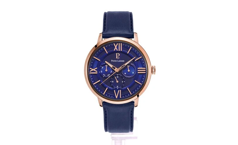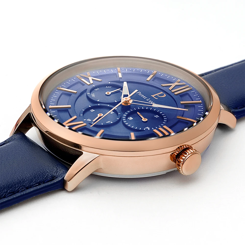 Son boîtier en acier inoxydable de couleur doré-rose de 42 mm de diamètre abrite un superbe fond de cadran au bleu profond où sont apposés les index, aiguilles et compteurs date également aux tons doré-rose.