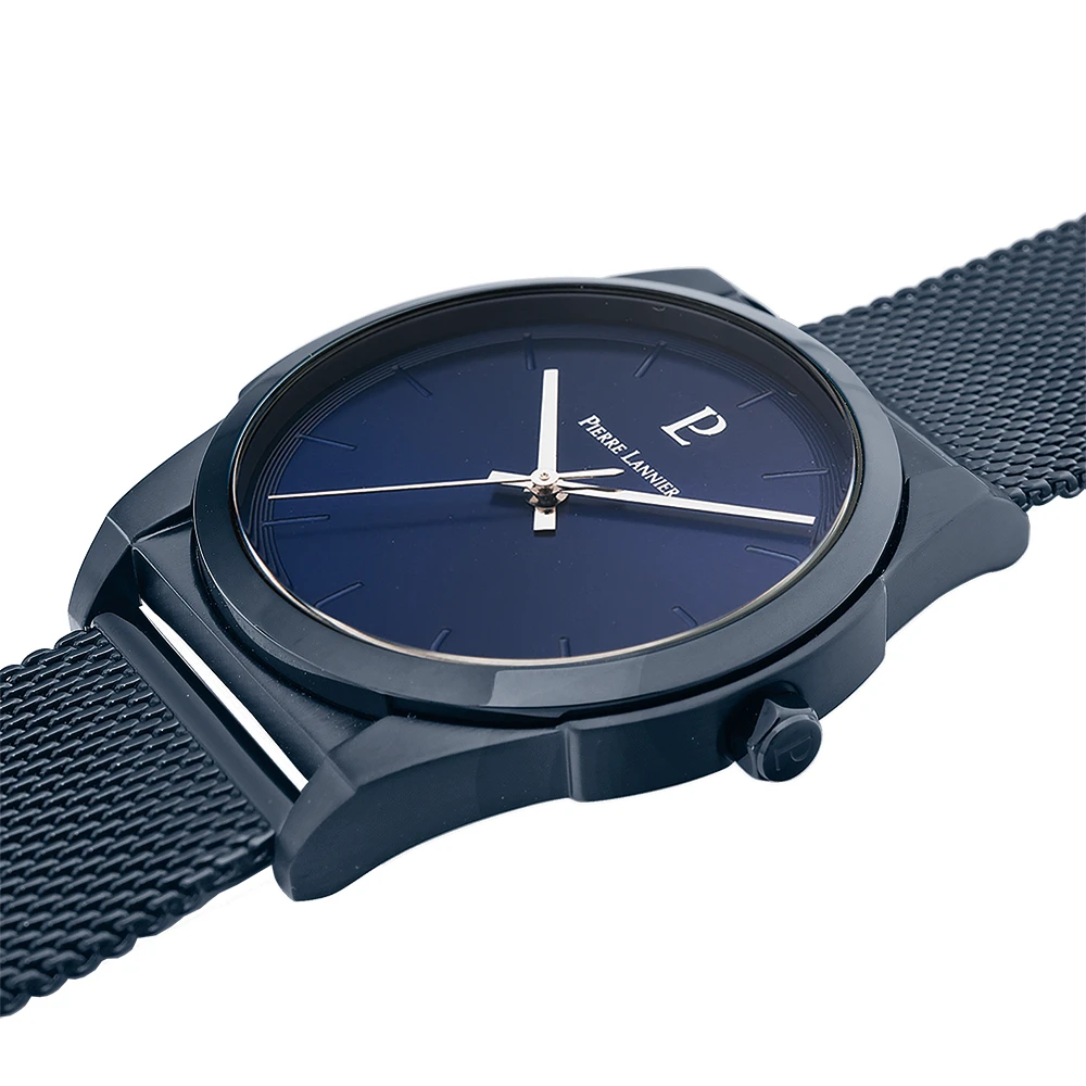 La montre Homme Candide 214K468 possède un boitier rond et bleu de 38 mm de diamètre, soit une taille assez fine par rapport à d’autres montres plus imposantes. Il est en acier inoxydable et possède un verre minéral. A l’intérieur, le cadran est bleu soleillé, et les aiguilles se démarquent grâce à leur couleur argentée. Les index sont crantés, pour rester dans un design sobre.