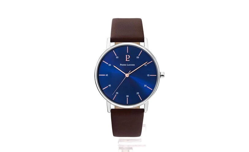 Les index bâtonnets, les fines aiguilles ainsi que la signature Pierre Lannier apposée à 12 heures aux tons doré-roses apportent une touche de relief supplémentaire à ce modèle.