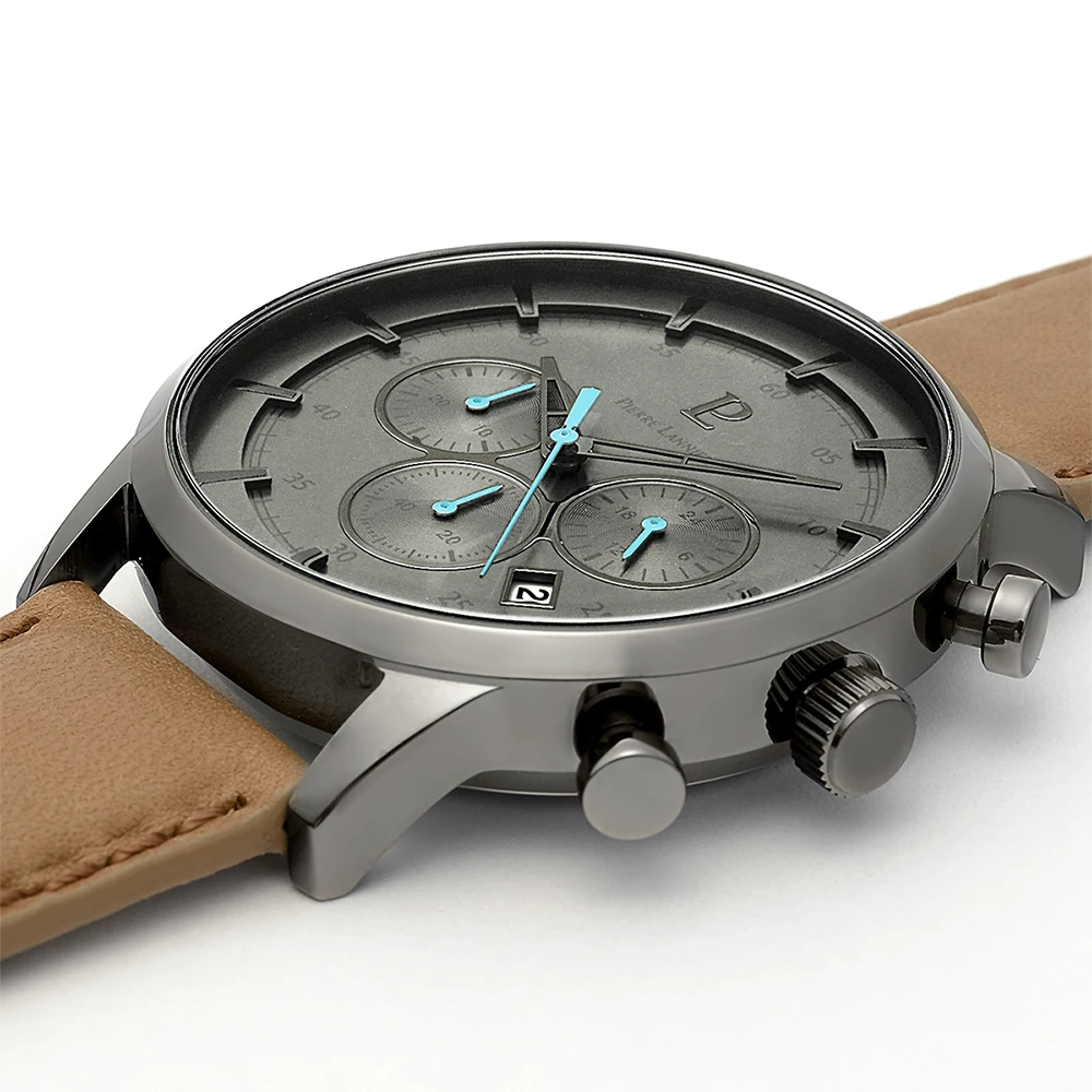 Celui-ci est habillé des 3 compteurs qui matérialisent la fonction chronographe de ce modèle : compteur heures à 3 heures, compteur secondes à 6 heures et compteur minutes à 9 heures. Vous pourrez ainsi mesurer des intervalles de temps très précis à votre convenance en actionnant ces aiguilles secondaires avec les poussoirs situés sur le côté droit du boîtier.