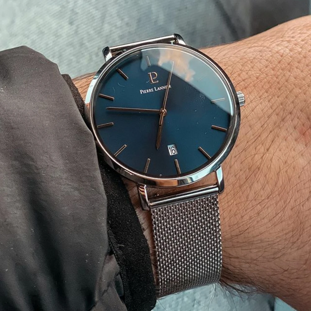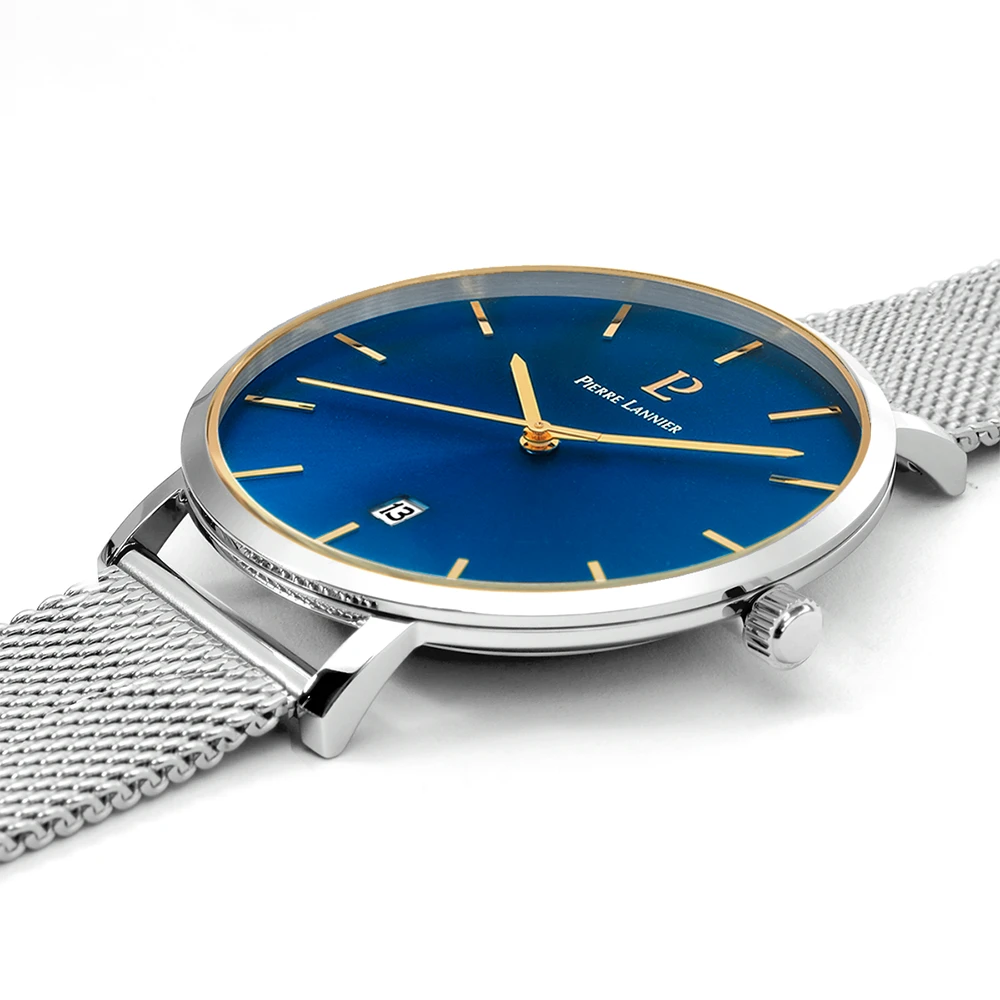 Pourvu d’un boîtier en acier inoxydable de couleur argentée de 40 mm de diamètre, ce modèle abrite un superbe fond de cadran au bleu profond avec un bel effet soleillé. Les aiguilles et les index bâtons sont de couleur dorée. De plus, le cadran possède un dateur à 6H. Le logo Pierre Lannier est aposé à 12h, légèrement bombé et de couleur dorée.