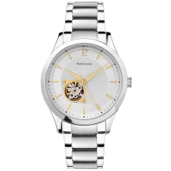 La montre automatique pour homme 336B121 possède un boitier en acier inoxydable argenté de 42.5 mm de diamètre. A l’intérieur, son cadran est guilloché, dans les tons argentés et le balancier est visible en perpétuel mouvement et cerclé d’une pièce dorée pour accentuer l’effet. Les aiguilles et les index sont fins et dorés.
