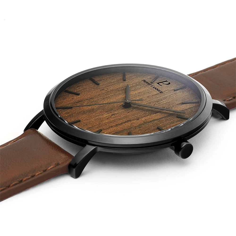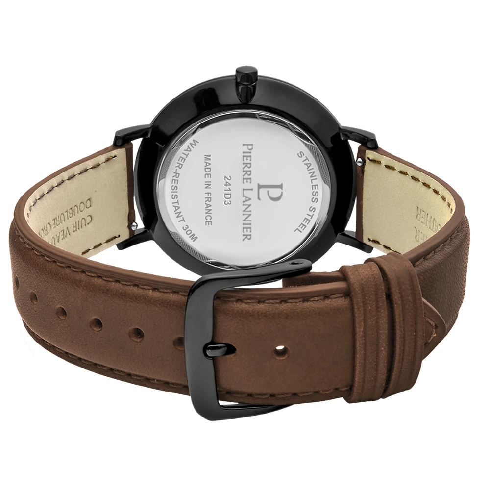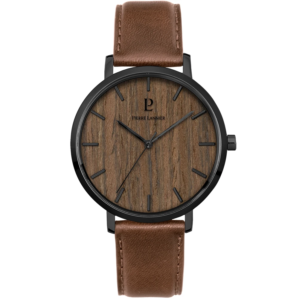 Avec son boîtier rond en acier noir poli inoxydable de 40mm de diamètre, la Montre Homme 241D384 Cuir Brun apporte allure et authenticité. Le fond de cadran en bois foncé met quant à lui finement en valeur les aiguilles, les index et la signature Pierre Lannier à 12 heures aux nuances argentées.