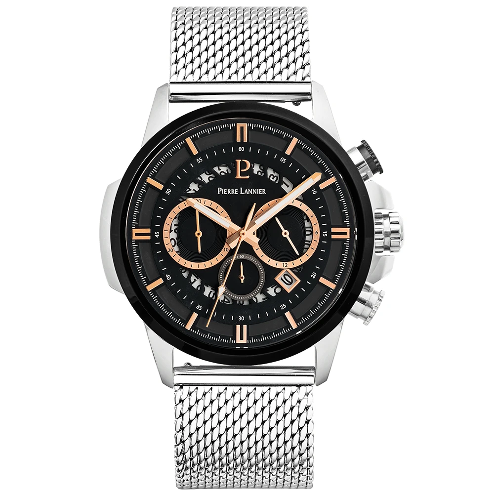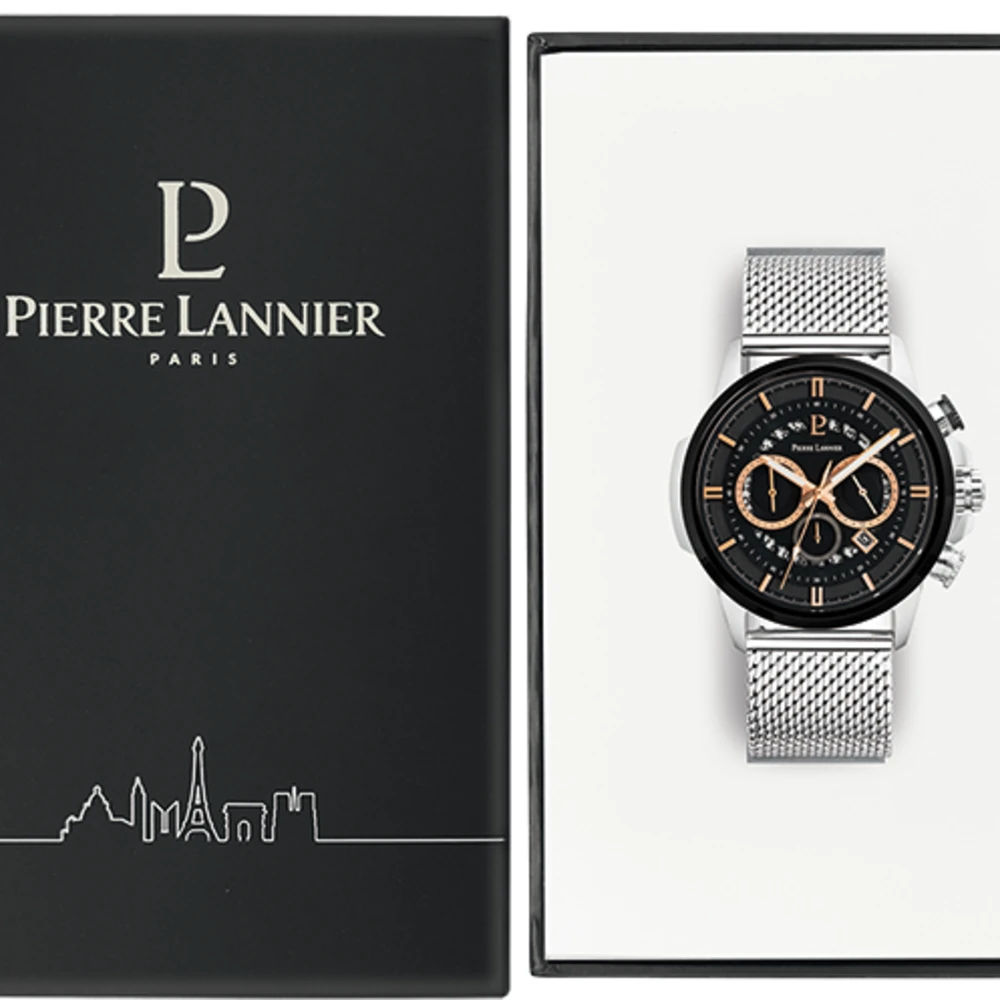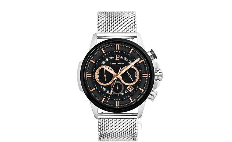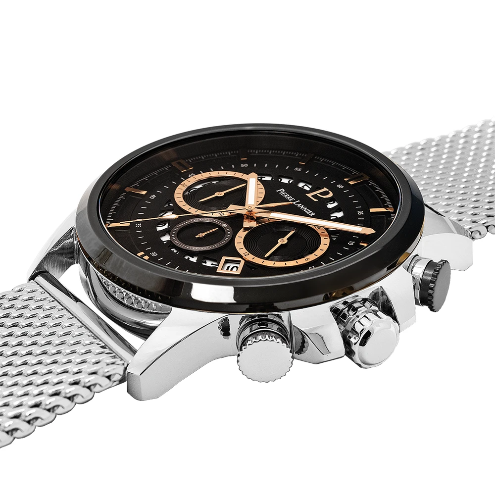 Son boîtier en acier inoxydable argenté d’un diamètre de 44mm est l’un des plus imposants de Pierre Lannier. Il possède des poussoirs travaillés dont les protèges couronne répondent à une contreforme à 9h. Le cadran de ce modèle est sans aucun doute sa pièce maîtresse : le mécanisme du chronographe est magnifié par des compteurs contrastés aux nuances doré-rose et par un starter plaqué. Le quantième est visible sur toute la surface du cadran et la date est bien lisible grâce à une ouverture dato cerclée.